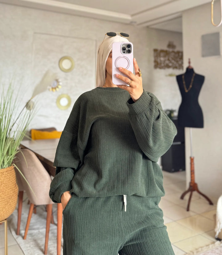 هاد الطقم مصمم خصيصاً للنساء اللي كيعشقو اللبسة المحتشمة والبسيطة، ولكن في نفس الوقت كلاسيّة وأنيقة. الثوب كيتميز بملمس ناعم، جودة عالية، وحركة مريحة فاليوم كامل 🌿